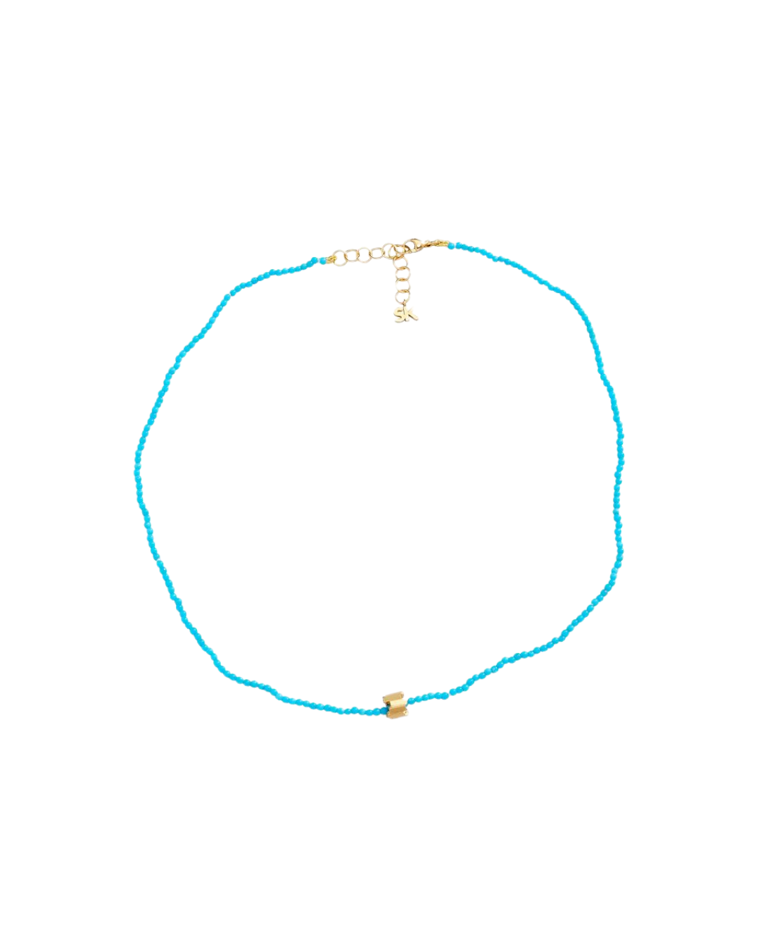 Suzanne Kalan�s 18K yellow gold Infinite Beaded Turquoise necklace features luminous turquoise beads accented with a solid gold rondelle center. This delicate, artfully designed piece radiates subtle elegance and modern sophistication. Perfect for layering or wearing solo, it adds a serene pop of color and refined luxury to any jewelry collection.