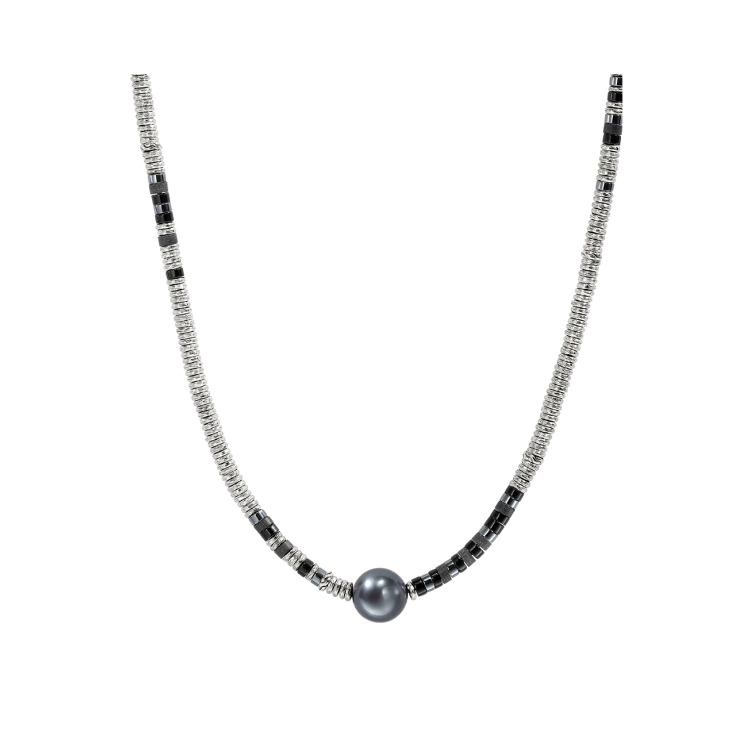 Featuring artisanal hand-cut beads that bring textured, coastal charm, this necklace is handcrafted in reclaimed sterling silver with natural hardstones and a grey pearl. Ethically sourced for conscious style.