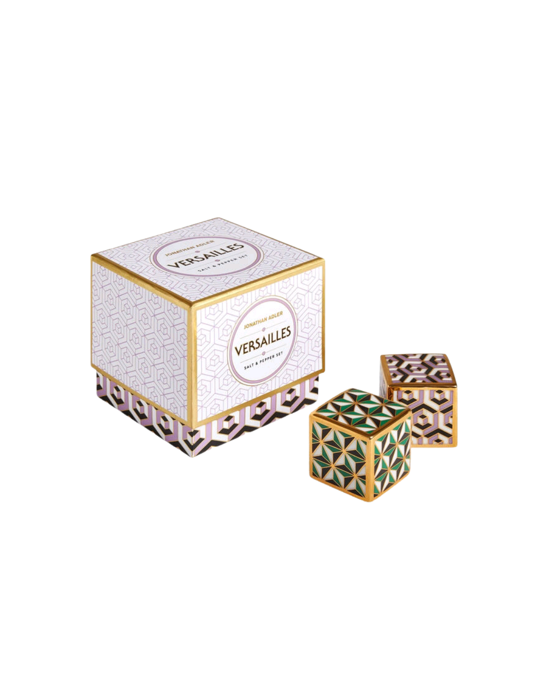 Featuring trippy geometric patterns in alluring amethyst and emerald, our high-fired porcelain Versailles Salt & Pepper Set shakes up your tablescape (and not without solid gold accents for added glamour).