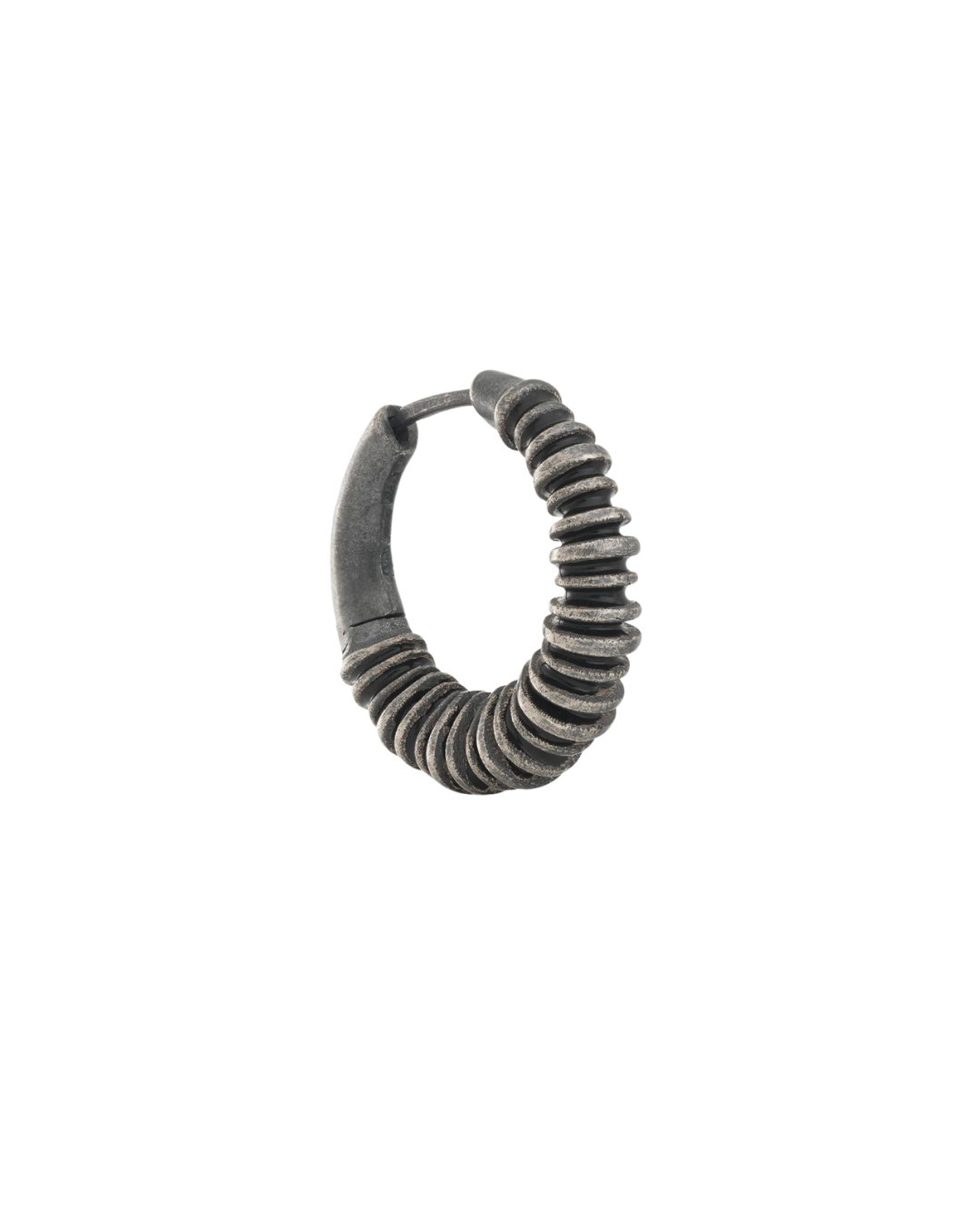 The Acies Hoop Earring by Marco Dal Maso is crafted in oxidized sterling silver and detailed with black enamel, combining bold contrast with sleek, modern design.