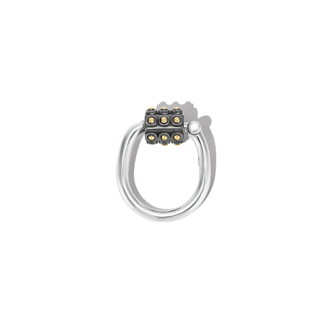 Crafted in sterling silver with gold ball accents, the Trundle Lock Ring takes its name from a 16th-century word for “small wheel.” Designed with flat sides for comfort, it functions as both a ring and a lock—perfect worn solo, stacked, or as a charm holder.