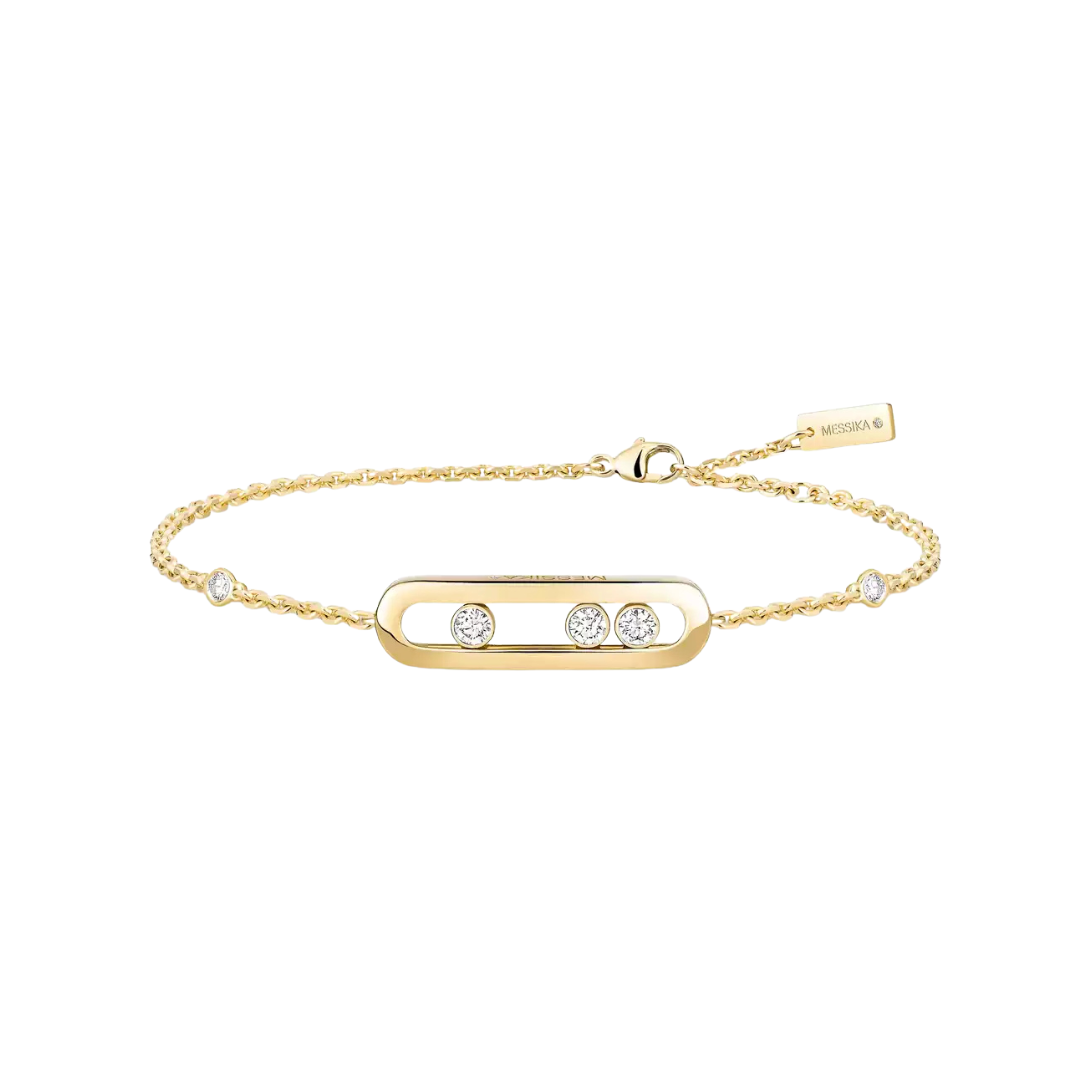 Crafted in radiant 18K yellow gold, the Messika Baby Move bracelet features 0.122 carats of G VS1 diamonds in perpetual motion. A delicate symbol of love and freedom, its sleek silhouette and luminous sparkle evoke timeless elegance—perfect for layering or wearing solo as a refined everyday statement.