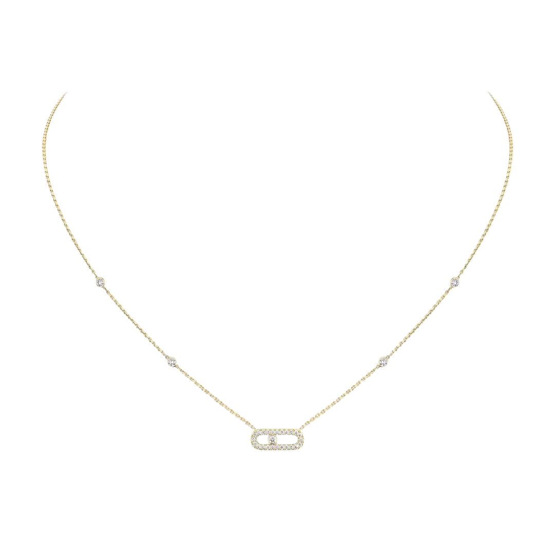 Messika 18K yellow gold Move Uno Pavé necklace shimmers with brilliance. A delicate chain suspends the iconic Move motif, featuring a pavé diamond frame and a single floating diamond. Effortlessly chic, this timeless design adds refined sparkle, perfect for layering or wearing solo. Adjustable length for versatile styling.
