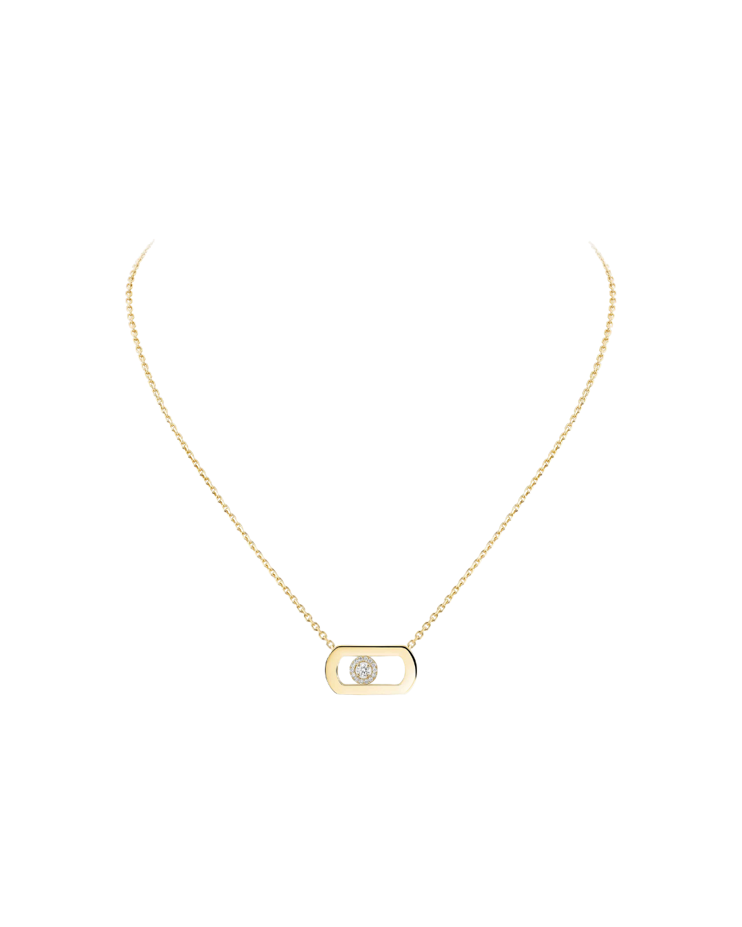 A graceful tribute to modern elegance, the Messika So Move necklace in 18K yellow gold highlights a luminous 0.113 ct G/VS1 diamond that glides with subtle motion. Its sculptural silhouette and refined craftsmanship create a radiant everyday statement, blending contemporary sophistication with the timeless allure of Parisian jewelry artistry.