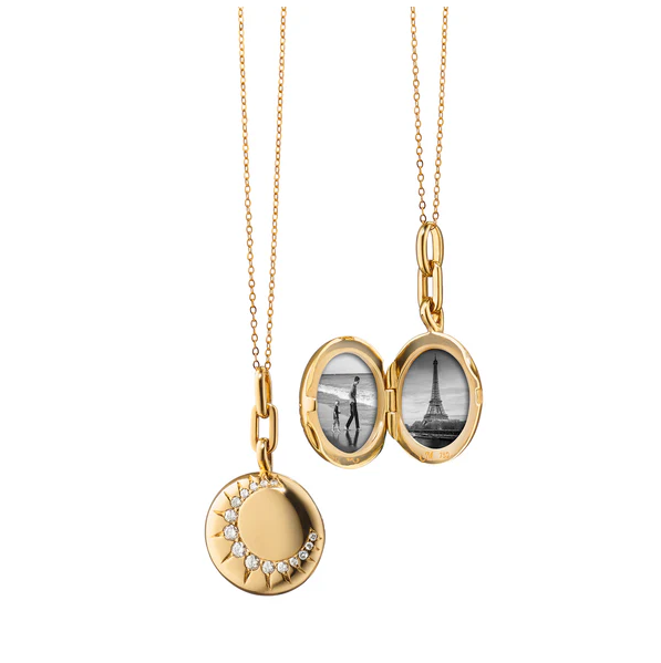What’s your story? Our Round “Sun” Locket Necklace with Diamonds features a sleek, slim profile perfect for everyday wear. Crafted in 18K yellow gold, this locket is set with diamonds and includes a 17″ yellow gold chain. The locket measures 11/16″ in diameter and holds two images, making it a meaningful and personal piece. Keep your stories close, as the images can easily be inserted into the inside of the locket.