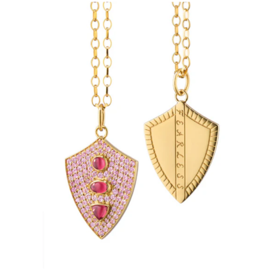 Forge your own path and be fearless with this 18K Yellow Gold shield, featuring pave pink sapphires and bezel set rhodolite stones. Engraved with “Fearless” down the back, let it be your silent guardian. Crafted in 18K yellow gold, the pendant measures 1 1/8″ tall and 3/4″ wide.