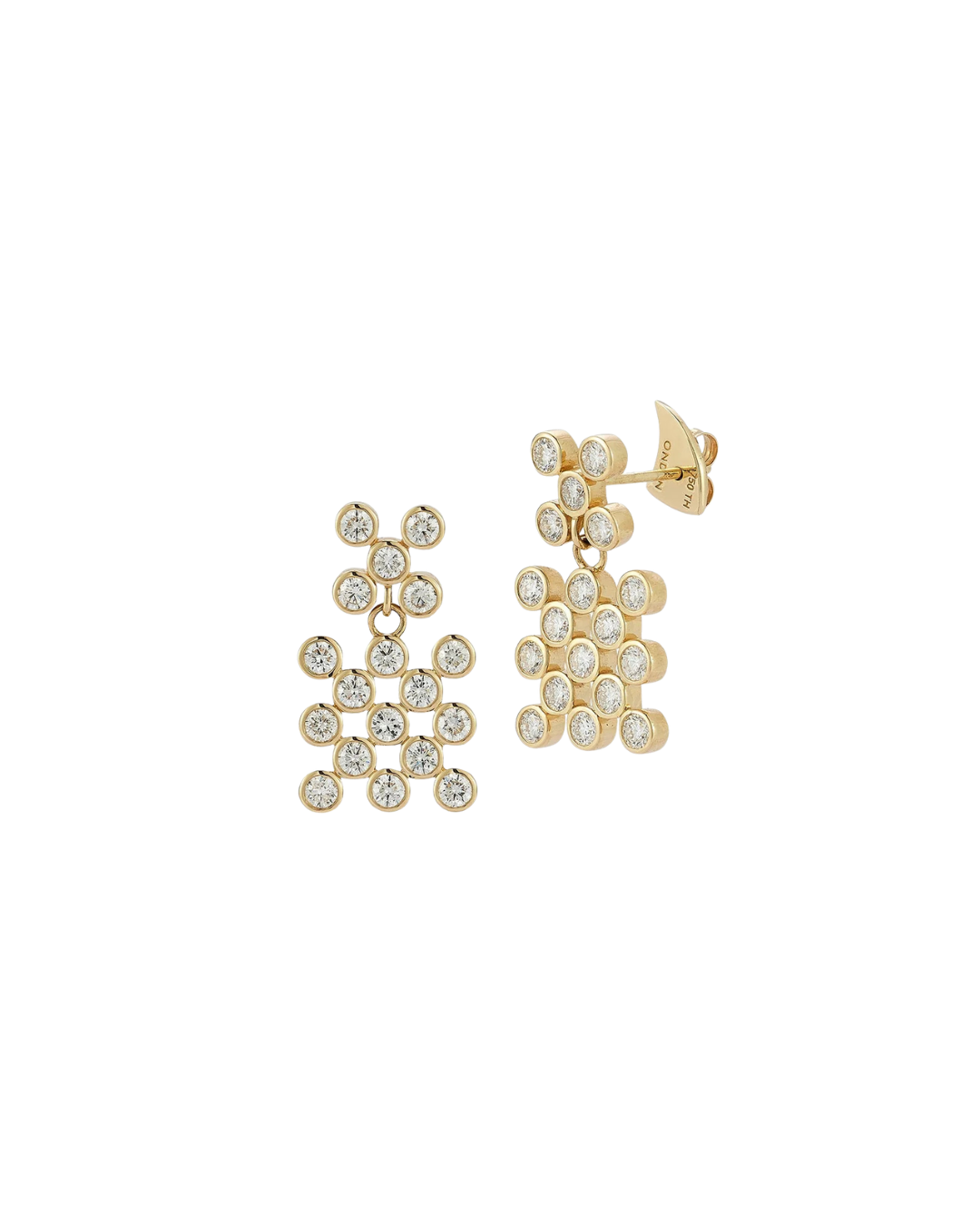 Elevate your elegance with the ONDYN 18K Yellow Gold Checkmate Diamond Earrings. Crafted with precision, these stunning earrings feature a classic checkmate design adorned with brilliant diamonds 2.13 carats, H color, SI clarity, exuding timeless sophistication and unparalleled luxury. Perfect for any occasion, they add a touch of refinement and sparkle to your look. Shine brighter with ONDYN.