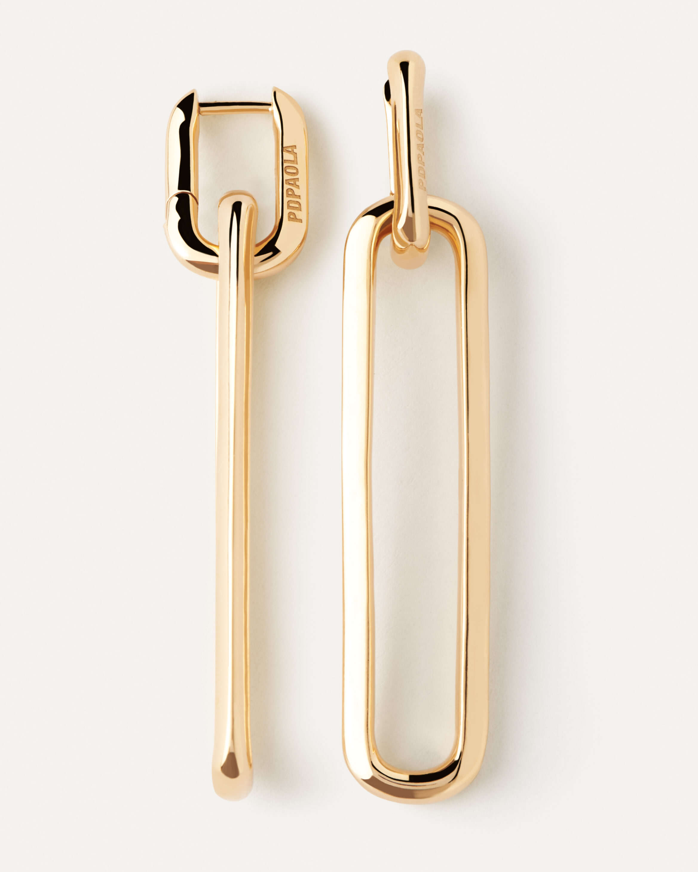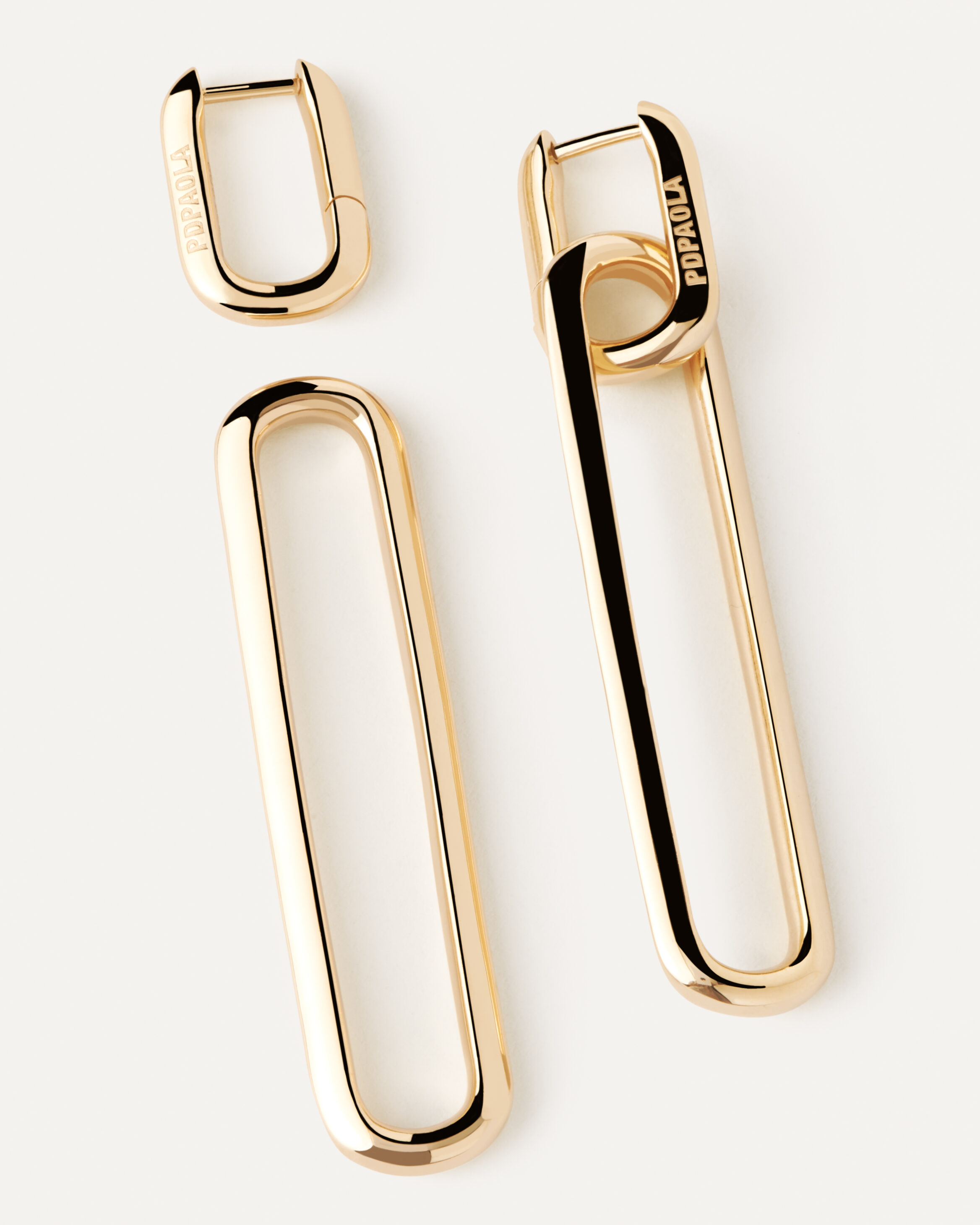 Gold-plated geometric oval drop earrings with removable interlinking paperclip chain
