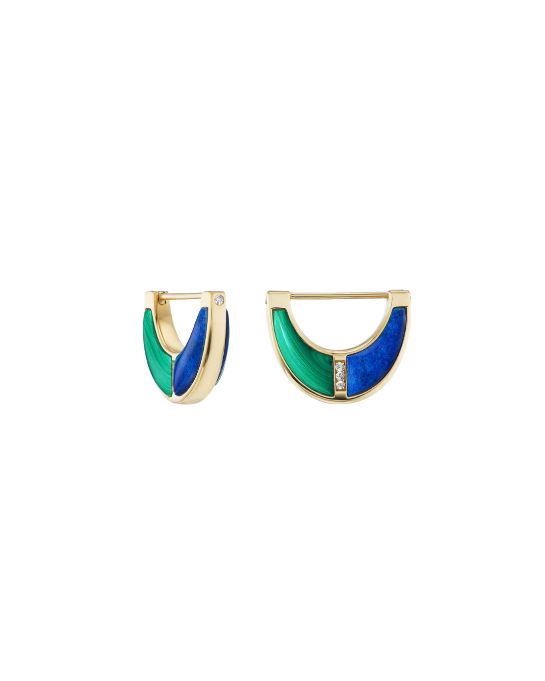 Sorellina’s Huggie Earrings in 18k yellow gold feature 2.10cts of vibrant lapis lazuli, 2.10cts of striking malachite inlay, and 0.11cts of sparkling G-H SI diamonds. These bold yet elegant earrings offer a captivating blend of color and luxury, perfect for elevating any look with modern sophistication.