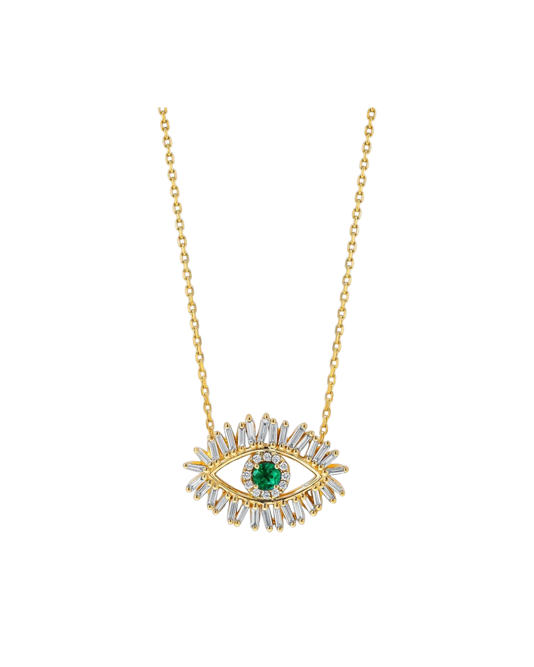 18K Yellow Gold Medium Firework Evil Eye with Emerald & Diamond Necklace
