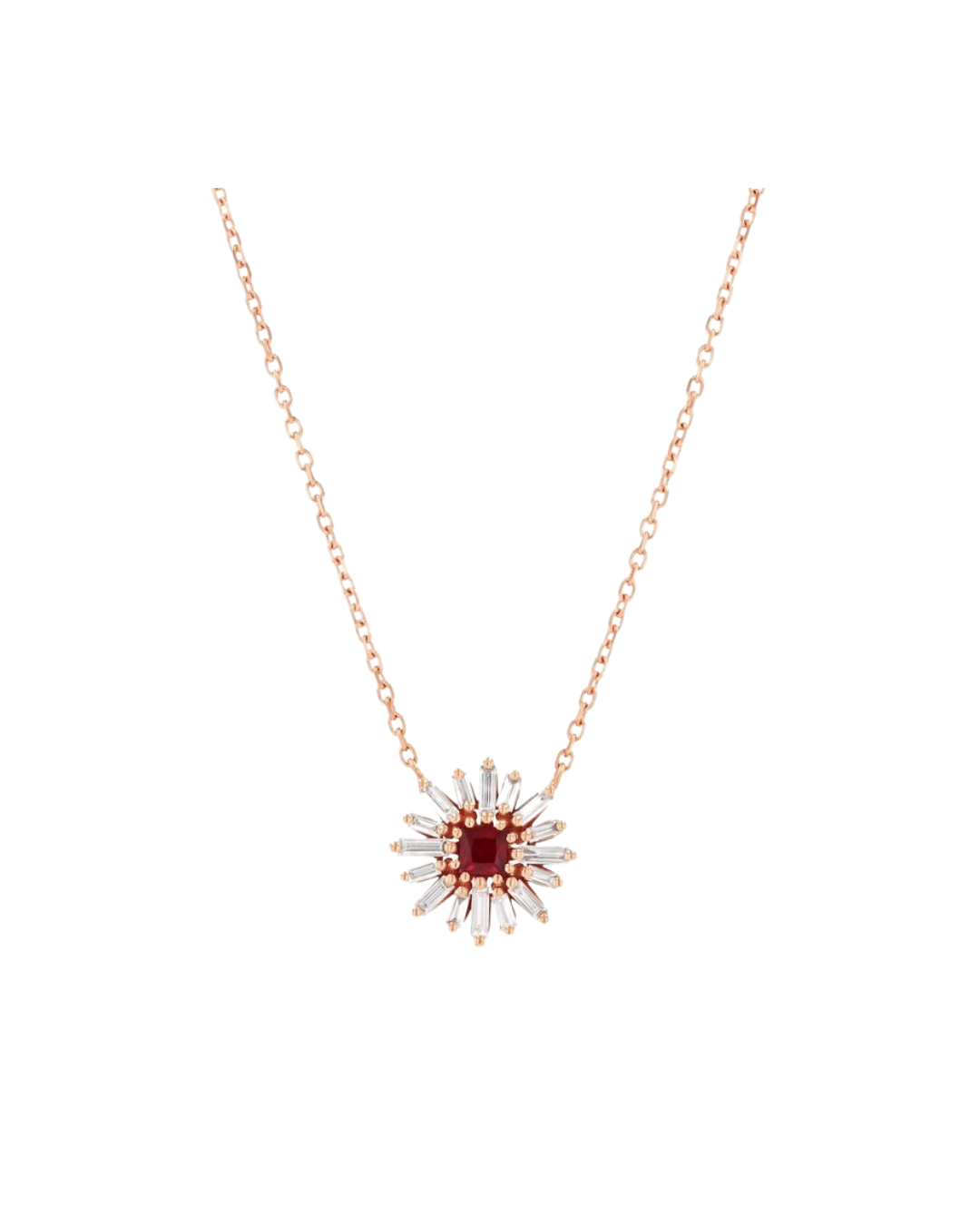 Suzanne Kalan�s 18K rose gold Princess Ruby Flower pendant radiates elegance with a princess-cut ruby center, surrounded by white diamonds and baguette diamonds . Suspended on an adjustable chain, this exquisite necklace blends modern artistry with timeless, radiant beauty.