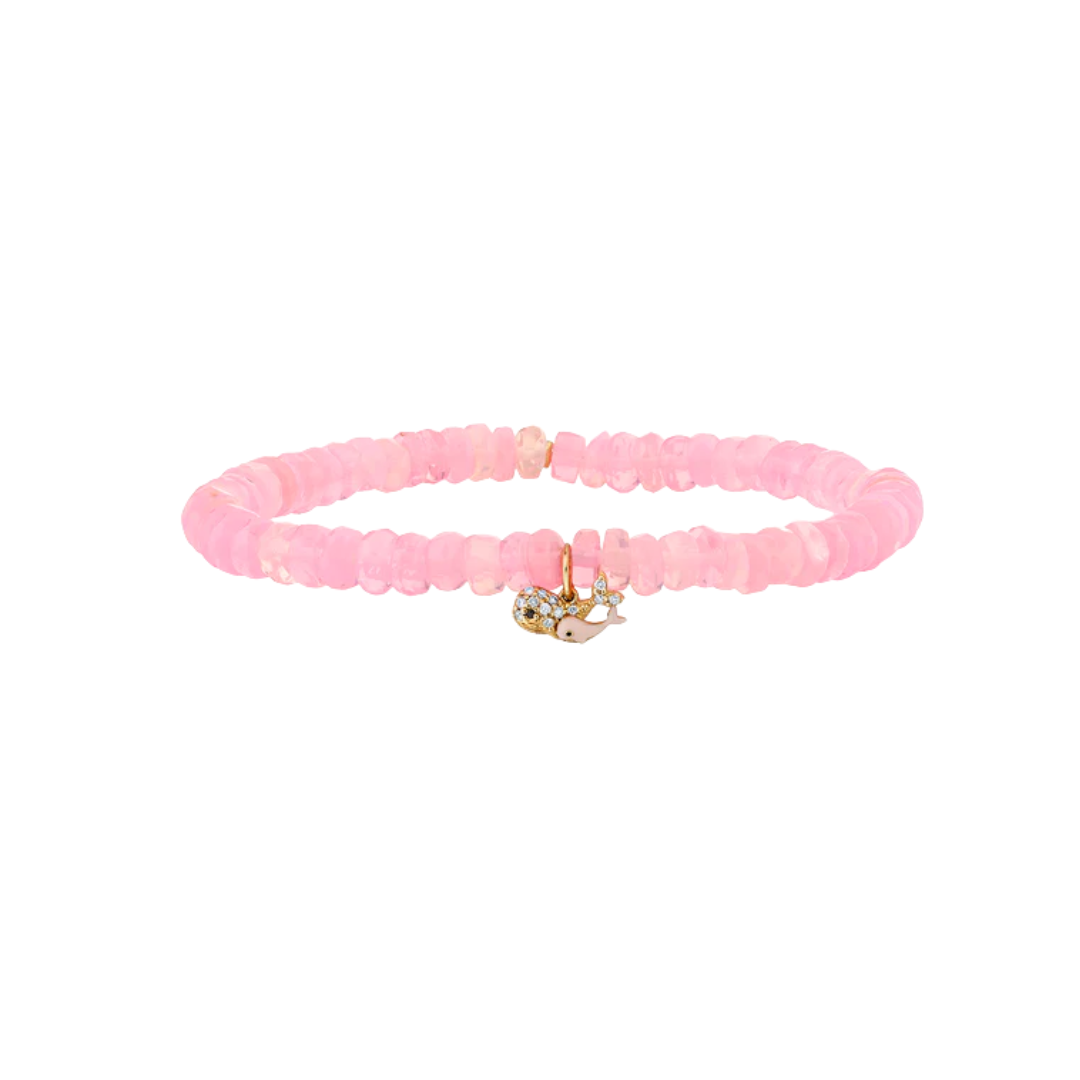 Crafted in 14K gold, this whale family charm is adorned with diamonds and blush enamel, suspended on 4mm cotton candy glow Ethiopian opal rondelles. Symbolizing unity and love, the bracelet is strung on a stretch cord for a comfortable fit and finished with our signature 14K gold SE logo charm. Standard size is 6.25″.