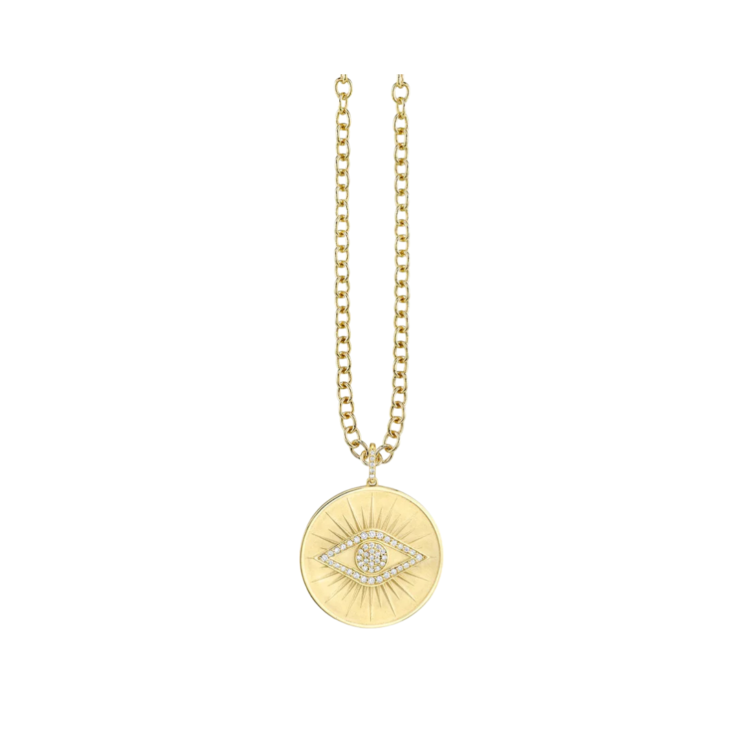 Crafted in 14K yellow gold and diamonds, this Protective Eye coin charm is both a radiant statement and a powerful talisman. Intricate sunray details surround the central eye, symbolizing protection, light, and positive energy. Measuring 1″ by 1″, the reversible design offers two unique looks, suspended from an adjustable 18″ oval link chain for the perfect fit.