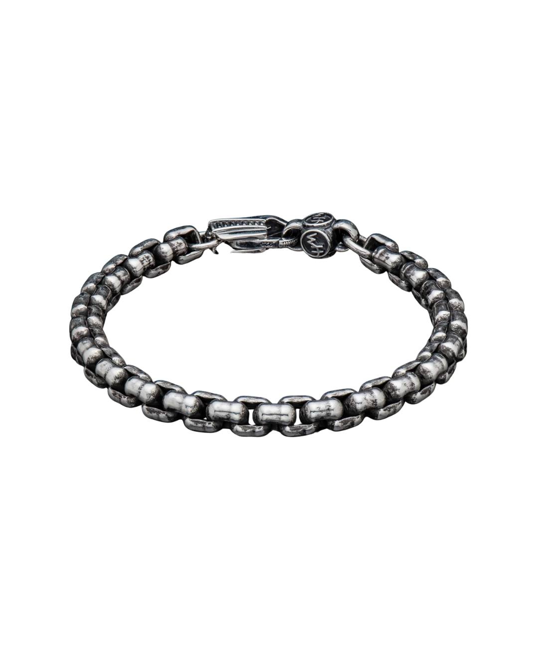 YDRA bracelet features intricately crafted sterling silver links with refined geometric design. Finished with gentle oxide and hand polish, it offers depth and timeless appeal. Custom sterling silver lobster clasp completes piece, delivering secure wear. Perfect worn solo or stacked, this bracelet balances classic style with distinctive craftsmanship for everyday elegance.