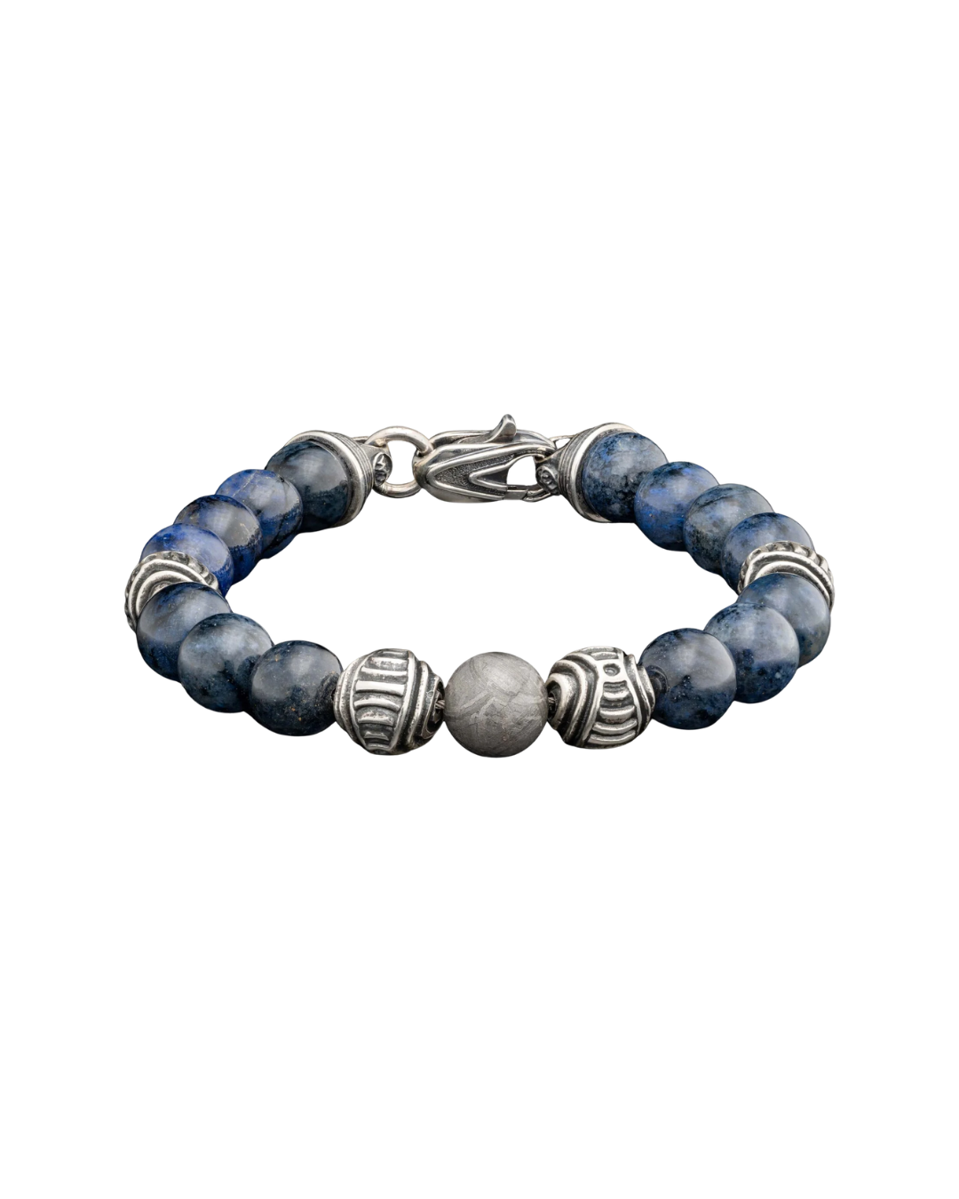 Celestial is a captivating beaded bracelet that combines the deep blue hues of dumortierite with rare meteorite and polished silver embellished beads. Inspired by the mysteries of the cosmos, this design offers a unique connection to the universe, blending natural elegance with a bold, timeless statement of style.