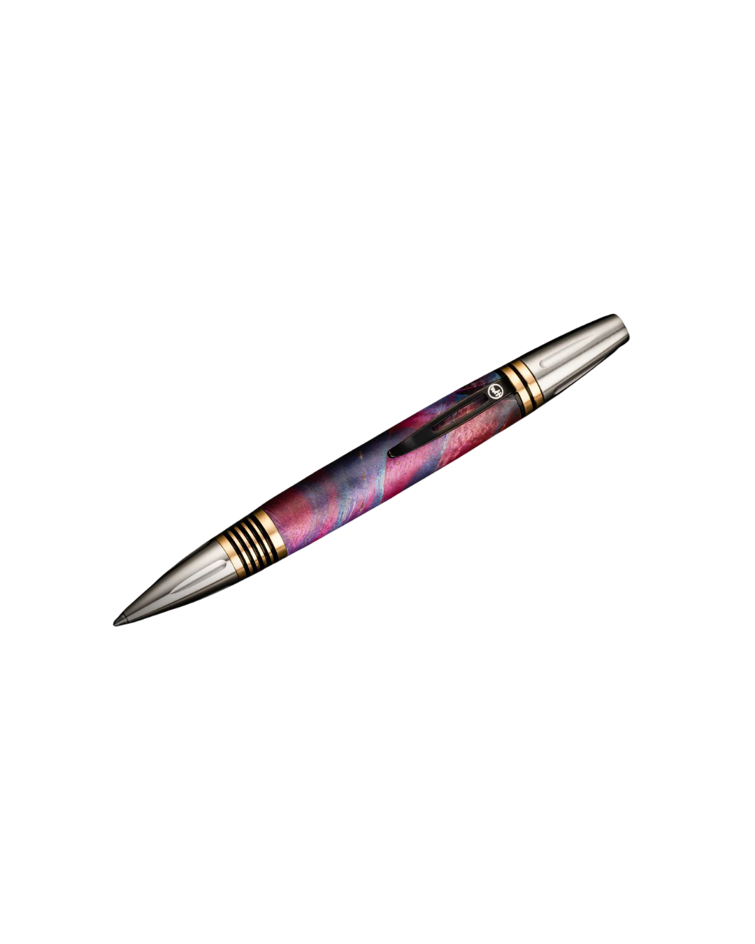 William Henry Caribe 14 pen features dyed maple burl barrel with rich grain and warm character. Brass spacers with deep grooves provide secure grip, while stainless steel tip and top showcase art deco detail. Smooth German refill and top-twist mechanism ensure effortless writing, delivering lasting craftsmanship and timeless executive appeal for everyday use.