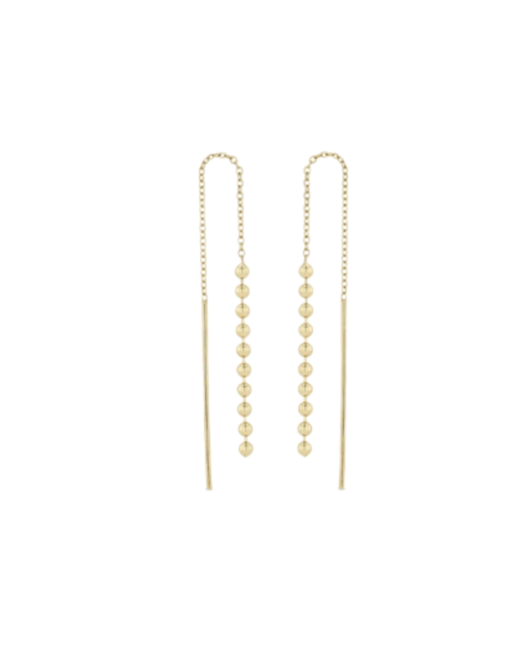 These 14K gold threader earrings feature a sleek 2mm bead chain design that glides effortlessly through the ear. Lightweight and fluid, they create graceful movement and a modern silhouette. Perfect for layering or wearing solo, they offer understated elegance with a contemporary edge for everyday styling.