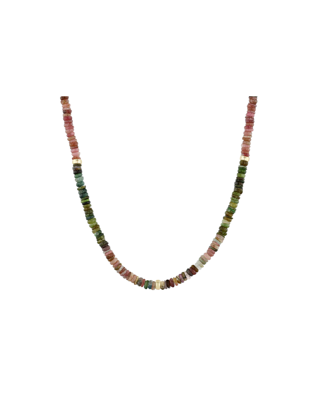 This 14K gold necklace features vibrant 6mm rainbow tourmaline rondelle beads accented with five gold beads for added dimension. The 32-inch length offers a fluid, elongated silhouette, showcasing a spectrum of color. Perfect for layering or wearing alone, it delivers bold yet refined everyday style.