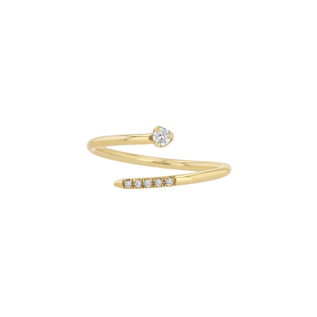 A sculptural bypass ring crafted in 14K yellow gold with a prong-set 5pt diamond on one side and 5 French pavé-set diamonds on the other. Perfect for stacking or wearing solo.